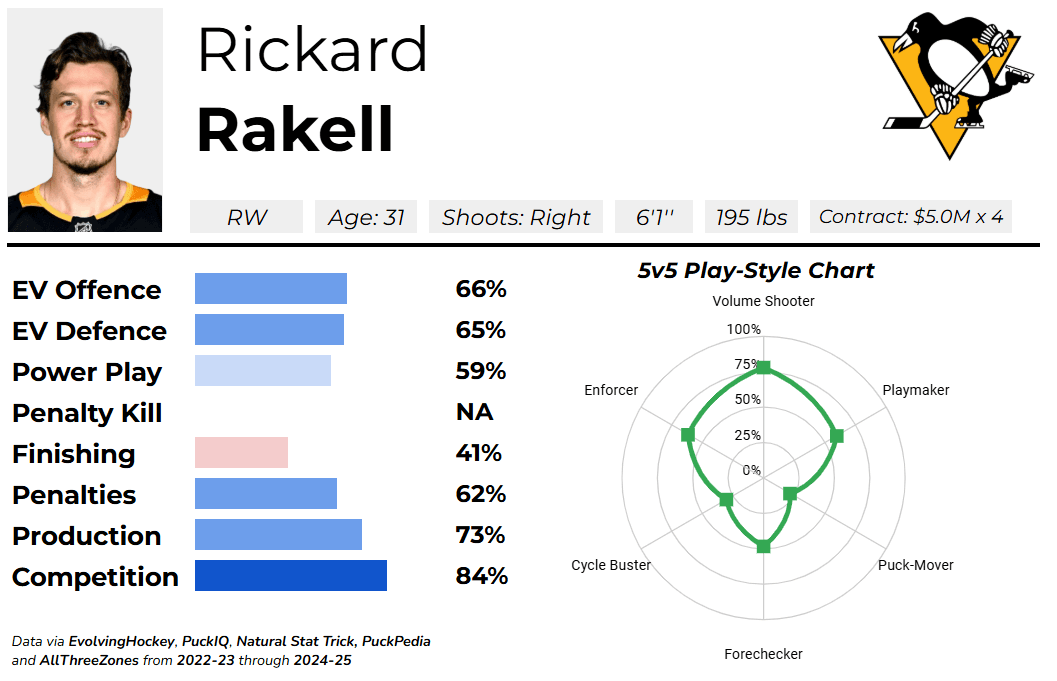 Rickard Rakell is a 31-year-old right-winger on the Pittsburgh Penguins, carrying a cap hit of $5M for the next four seasons. Rakell ranks second on Chris Johnston’s Trade Board.