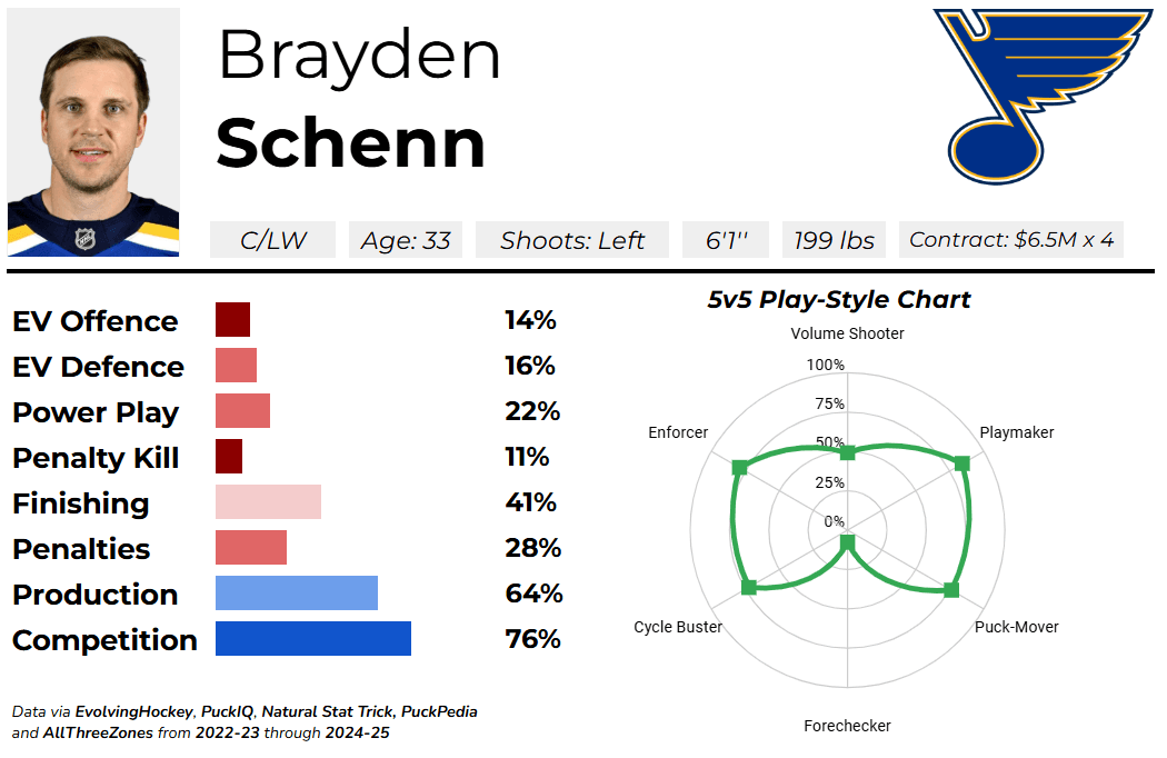 On the surface, Schenn seems to be on the same level as someone like Nelson or McCann. He’s on pace for nearly 50 points this season on a middling Blues team, he can play both centre and wing, his microstat profile seems solid, and he provides invaluable veteran experience. What’s not to love here?