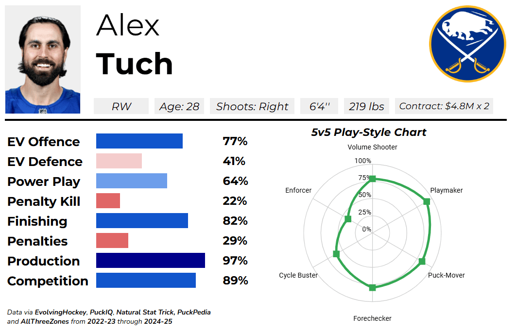 Overall, Tuch is one of the most efficient producers in the NHL at even-strength. Since the beginning of the 2022-23 season, Tuch has produced 2.54 points per hour at 5-on-5, ranking 12th in the NHL ahead of various notable stars such as Jack Eichel, Jack Hughes, Aleksander Barkov, Kirill Kaprizov and many more. He has very similar offensive rates to Nelson, and the advantage that Tuch possesses is that he’s superior defensively (though neither of them are defensive stalwarts), younger, cheaper, and has an extra year on his contract.