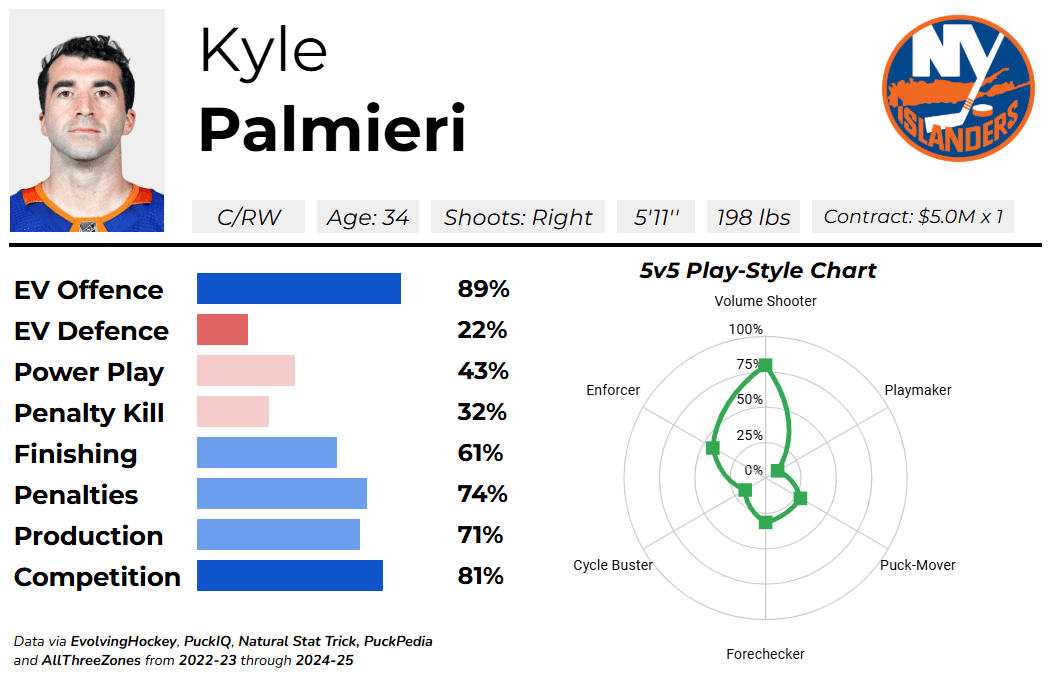 Kyle Palmieri is a 34-year-old forward on the New York Islanders, carrying a $5M cap hit that expires this summer. He ranks 14th on Chris Johnston’s Trade Board, and the Oilers were recently listed as a potential suitor for him.