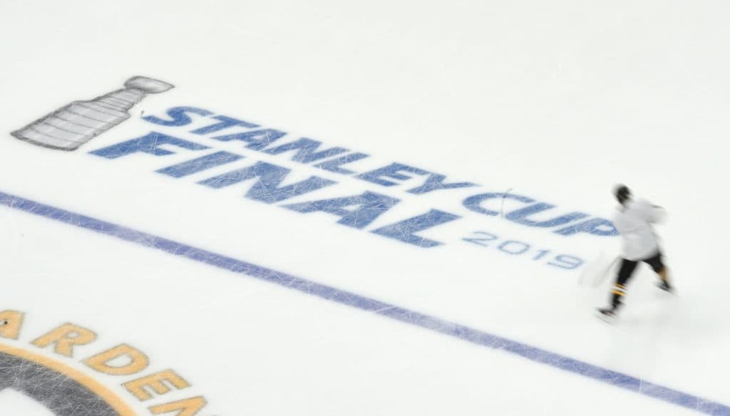 May 26, 2019; Boston, MA, USA; A general view of a log on the ice during Boston Bruins practice part as of media day for the 2019 Stanley Cup Final at TD Garden. Mandatory Credit: Bob DeChiara-USA TODAY Sports
