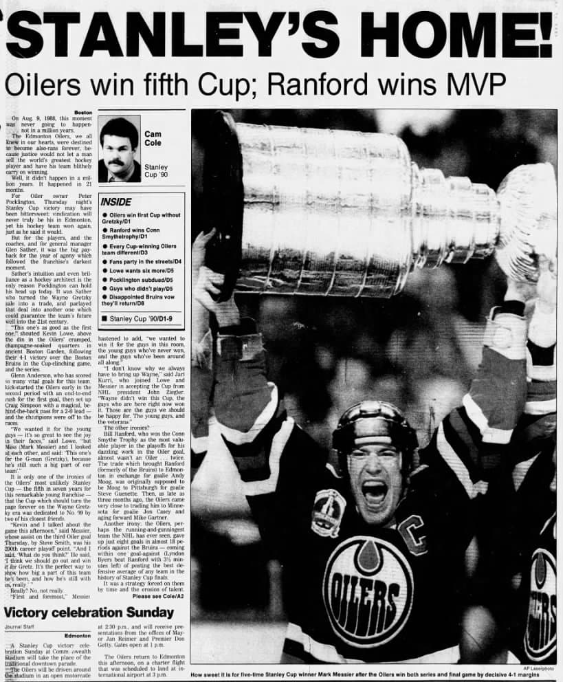A May 25, 1990 edition of the Edmonton Journal highlights the Oilers winning the 1990 Stanley Cup and Bill Ranford being named the Conn Smythe trophy winner.