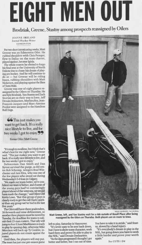 A Sept. 20, 2005 Edmonton Journal article details Matt Greene being assigned to the AHL.