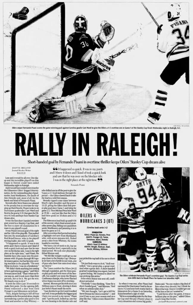 A June 15, 2006 edition of the Edmonton Journal details the Edmonton Oilers’ game five win over the Carolina Hurricanes.