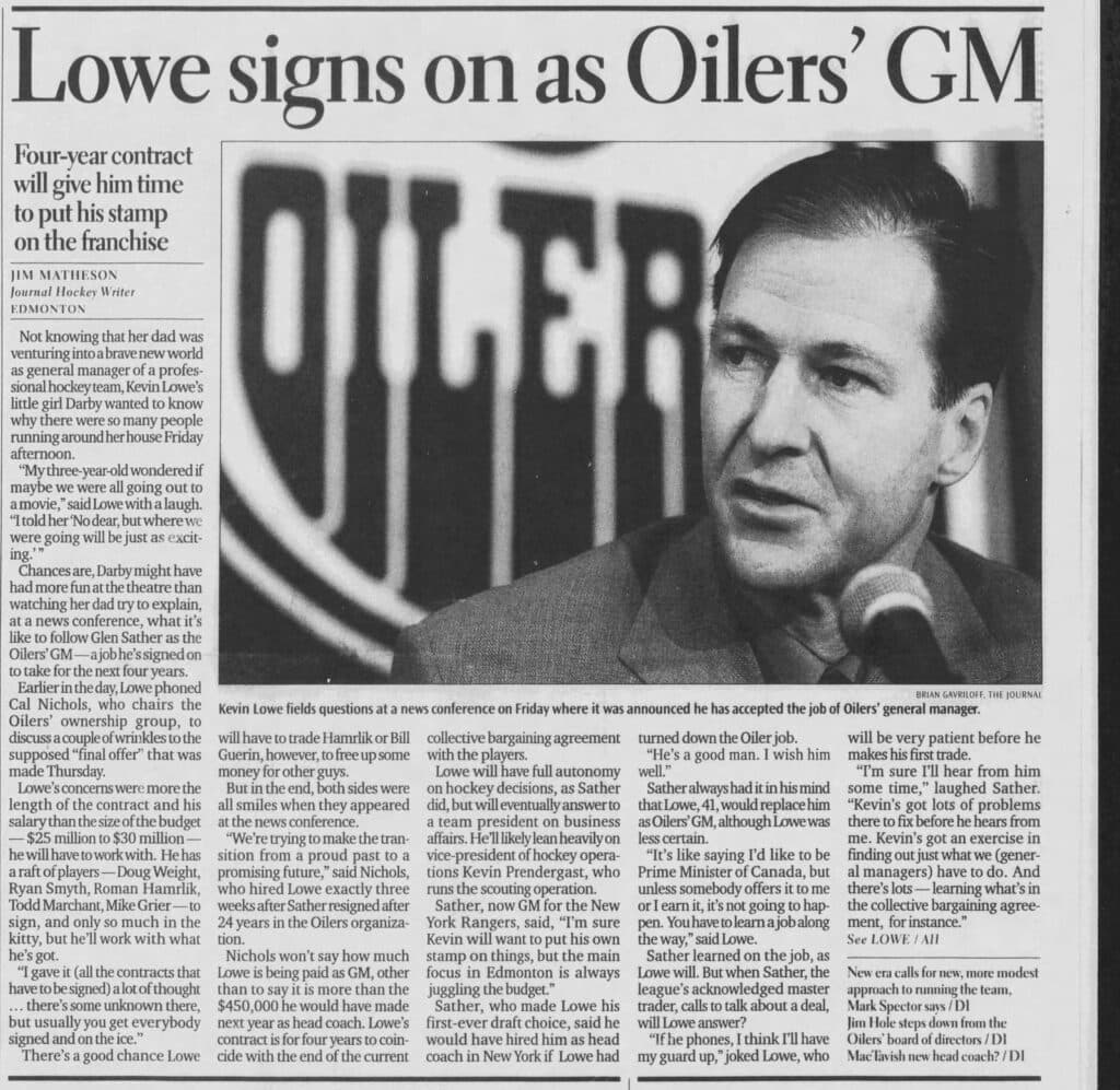 After spending two more seasons in New York, Lowe returned to Edmonton as a free agent in 1996. He played two more seasons with the Oilers and then joined the team’s coaching staff in 1998 after his playing career came to an end. General manager Glen Sather left the Oilers for New York in the summer of 2000 and Lowe took over his spot.