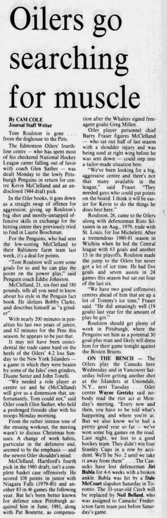 An article by Cam Cole of the Edmonton Journal at the time of the trade quoted Barry Fraser, Chief Oilers player personnel, saying the Oilers were in need of an enforcer like McClelland.