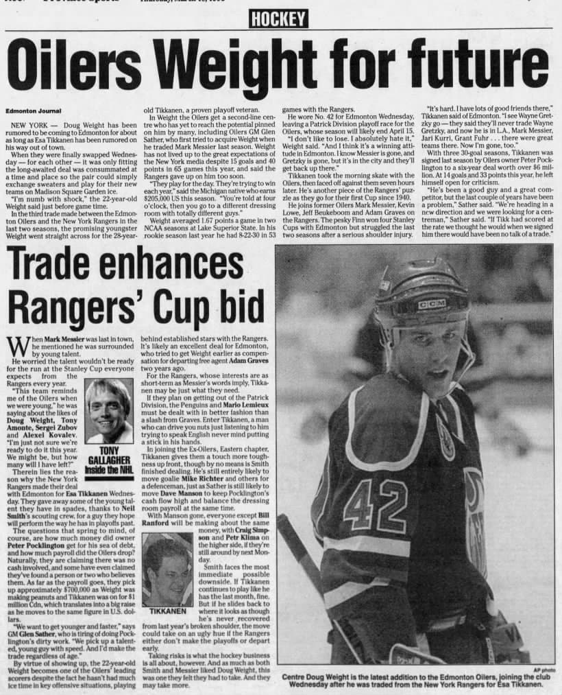 The Oilers, still in the stages of dismantling the dynasty team from the ’80’s, were looking to get younger. The deal, which had been rumoured for weeks, saw the Oilers bring in 23-year-old Weight while sending out 28-year-old Esa Tikkanen.