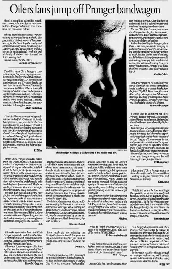A clipping from the June 28, 2006 edition of the Edmonton Journal details fan reaction to Chris Pronger’s trade request.