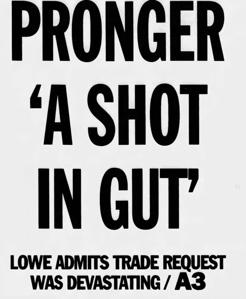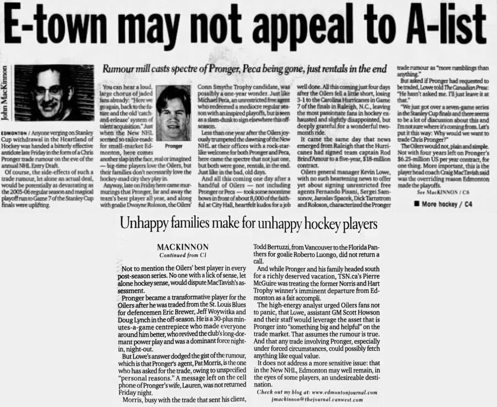 A headline from the June 25, 2006 Edmonton Journal shows reaction to the Chris Pronger trade request.