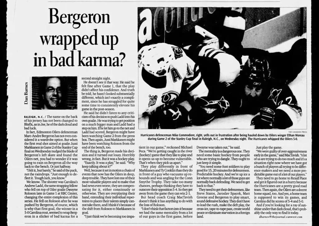During the playoffs, Bergeron logged 14:56 per game on Edmonton’s third pairing and scored a couple of goals. In the first game of the Stanley Cup Final against the Carolina Hurricanes, he checked opposing forward Andrew Ladd into goaltender Dwayne Roloson, knocking the Oilers’ goaltender out of the playoffs. The next game, the first shot that backup goaltender Jussi Markkanen faced went off of Bergeron’s skate and over his glove.