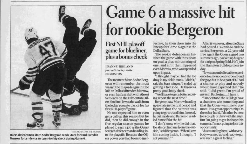 He scored a goal and an assist and logged 16:30 per game in his five-game debut and drew into the lineup during the Oilers’ win-or-go-home Game 6 in the first round of the playoffs with the Dallas Stars. Edmonton lost the game and the series but Bergeron made a name for himself with a huge open-ice hit on Stars winger Brenden Morrow.