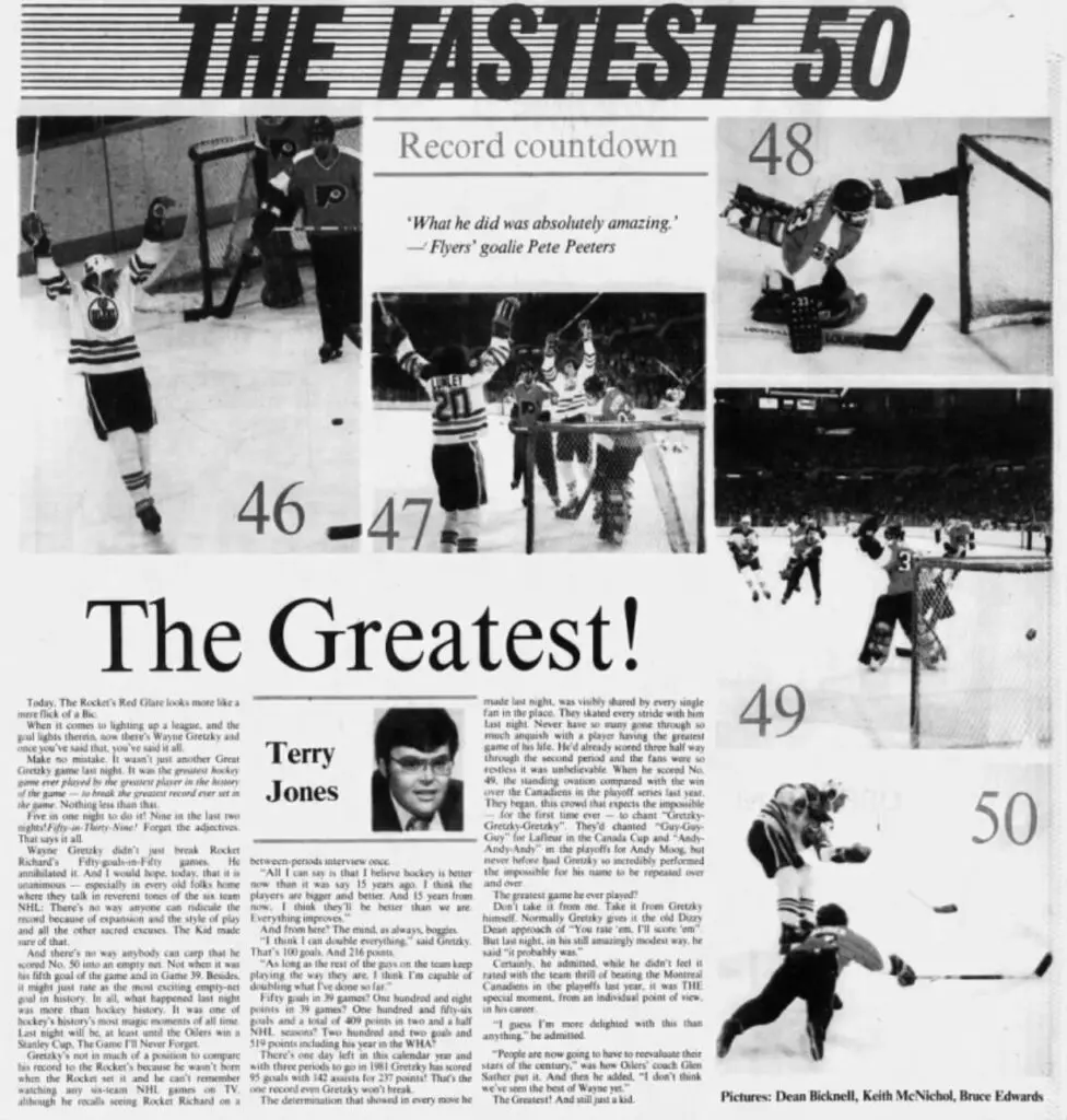 “His 50th, an uncharacteristic missile from 50 feet, tore past Greg Millen,” the Edmonton Journal’s Jim Matheson said of the goal.”