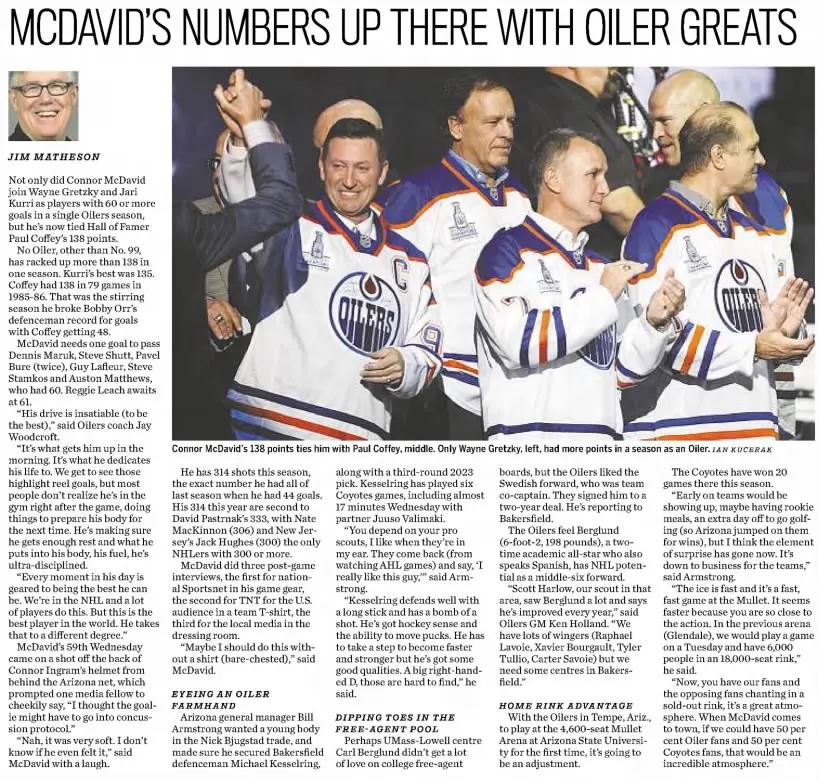 A March 24, 2024 article in the Edmonton Journal talks about Connor McDavid’s offensive success.
