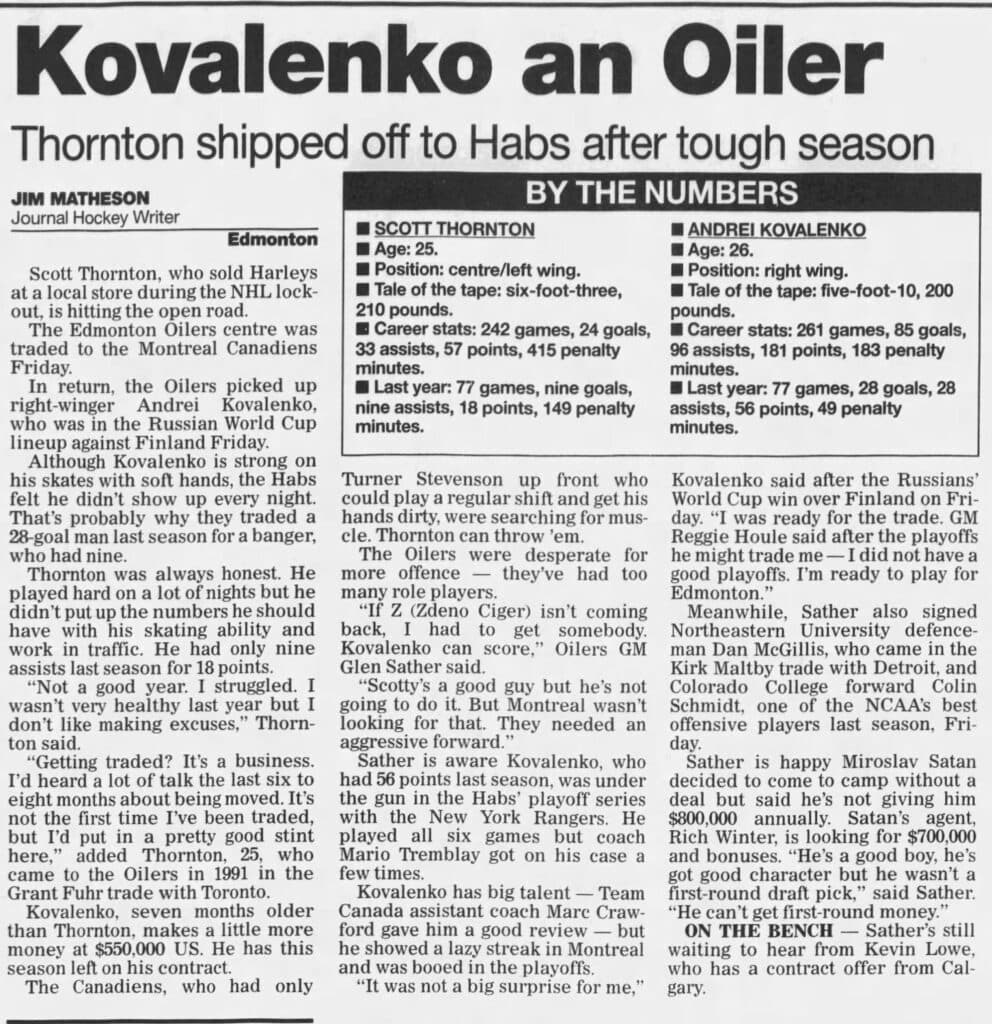 The following off-season, Kovalenko was shipped to the Oilers in exchange for Scott Thornton. While Thornton had once been a highly-touted prospect who went with the third overall pick in the 1989 draft, this was a pretty lopsided one-for-one swap. Thornton had 24 goals across 242 games in the NHL while Kovalenko had 85 goals in 261 games.