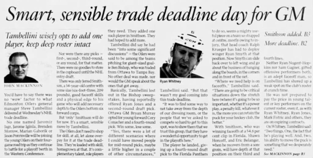 An April 4, 2013 article in the Edmonton Journal details the club’s trade deadline from the day prior. The only move the Oilers made was to acquire Jerred Smithson.