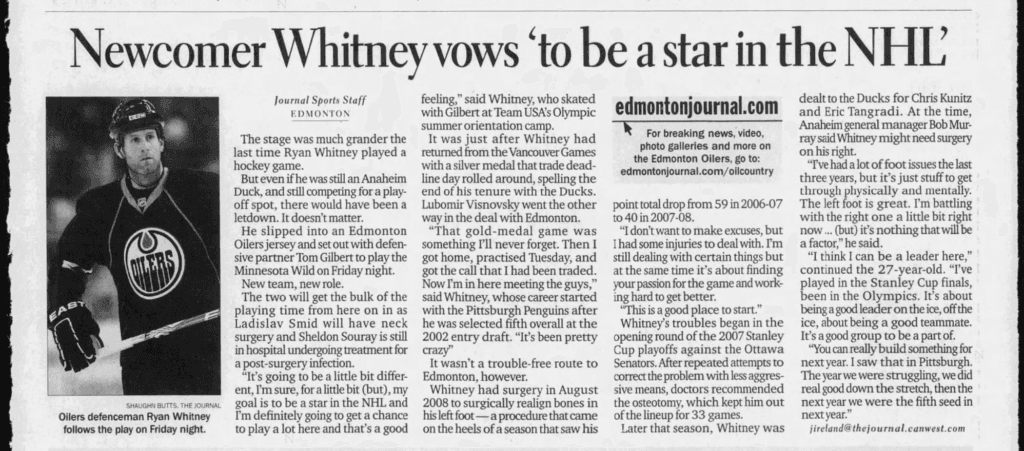 Whitney got off to a great start during his first full season with the Oilers in 2010-11. He scored 27 points over 35 games and logged 25:20 on average before injuring his foot during a game against the Buffalo Sabres in late December. It was later announced that Whitney would need to undergo surgery and that he wouldn’t return for the season.