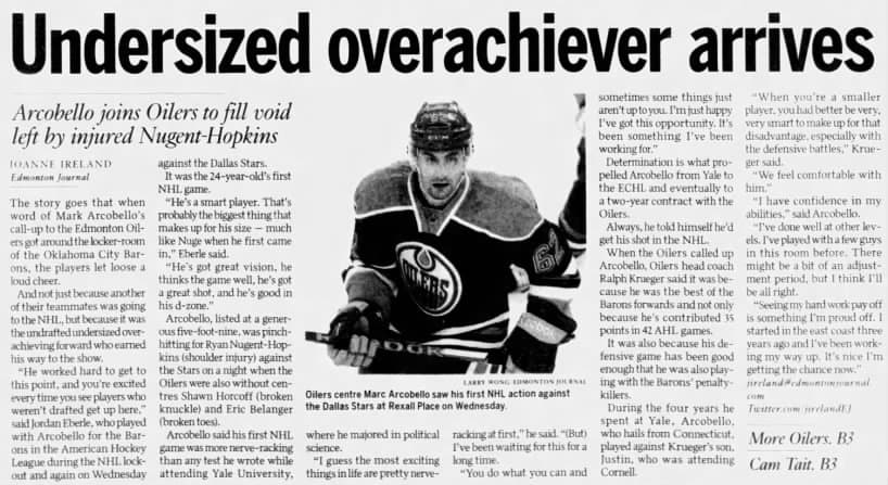 A Feb. 7, 2013 Edmonton Journal article details Mark Arcobello’s NHL debut.