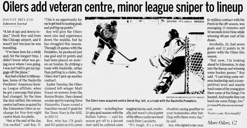 An Edmonton Journal article from Dec. 30, 2014 details the Edmonton Oilers trading Mark Arcobello for Derek Roy.