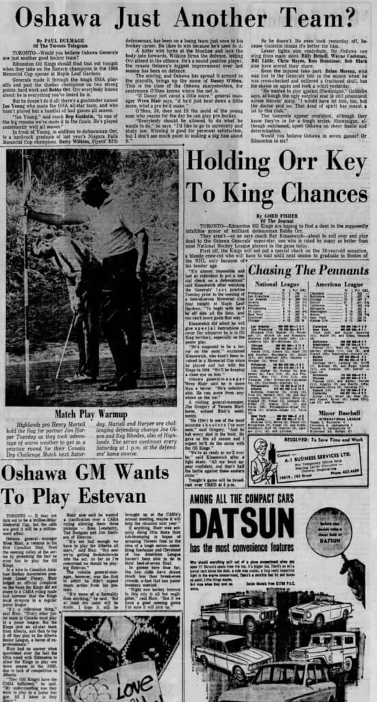 The Edmonton Journal’s Gord Fisher, meanwhile, looked at the Oil Kings who had a key goal in mind: “find a dent in the supposedly infallible armor of brilliant defenceman Bobby Orr,” noting the Kings had no plans for a special check on the “18-year-old sensation.”