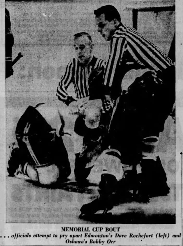 “Harrison also took part and triumphed in a third-period brawl which started when Oil King centre Dave Rochefort squared off with Orr — about whcihc started the only serious fireworks of the game,” Fisher wrote. “Although Rochefort and Orr struggled to a daw, Harrsion easily decision defenceman Bill White.