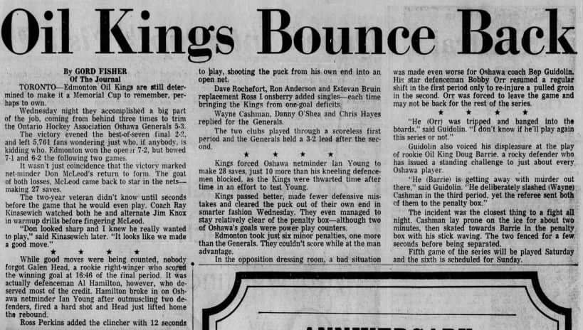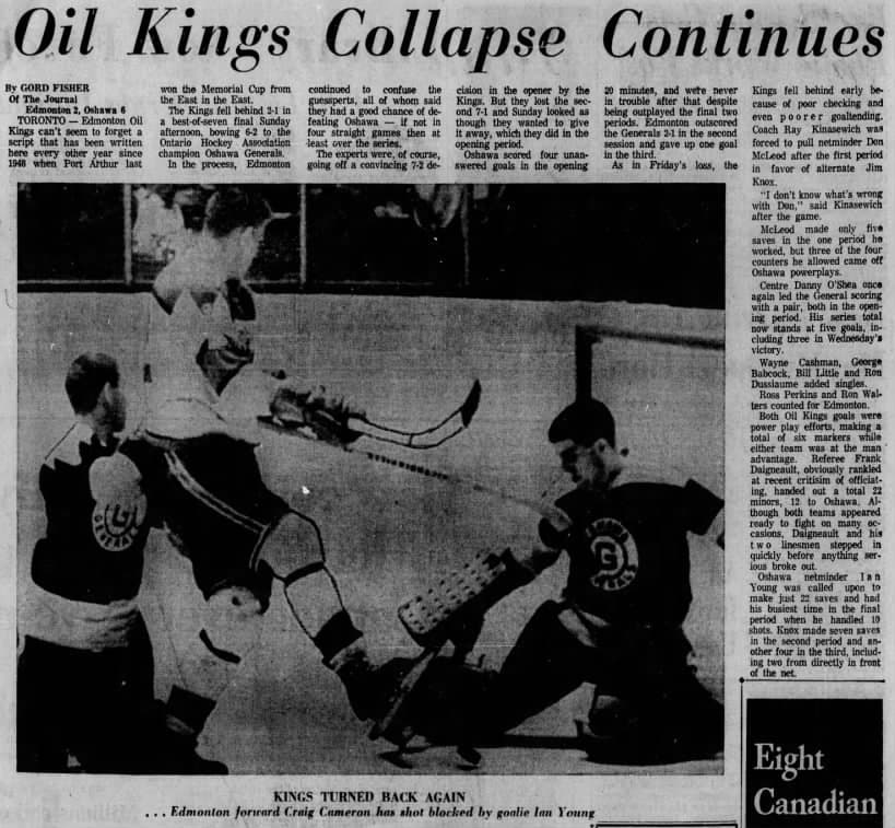 A May 12, 1966 article in the Edmonton Journal details game four of the 1966 Memorial Cup between the Edmonton Oil Kings and Oshawa Generals. Edmonton won 5-3.