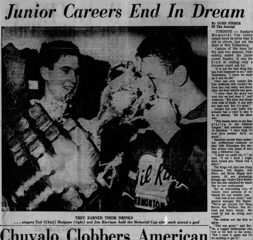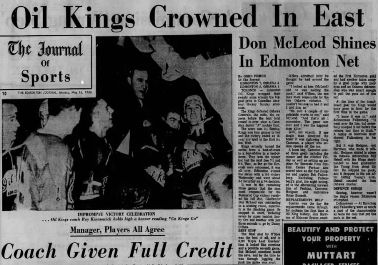 A May 16, 1966 Edmonton Journal article details the Edmonton Oil Kings winning the 1966 Memorial Cup.