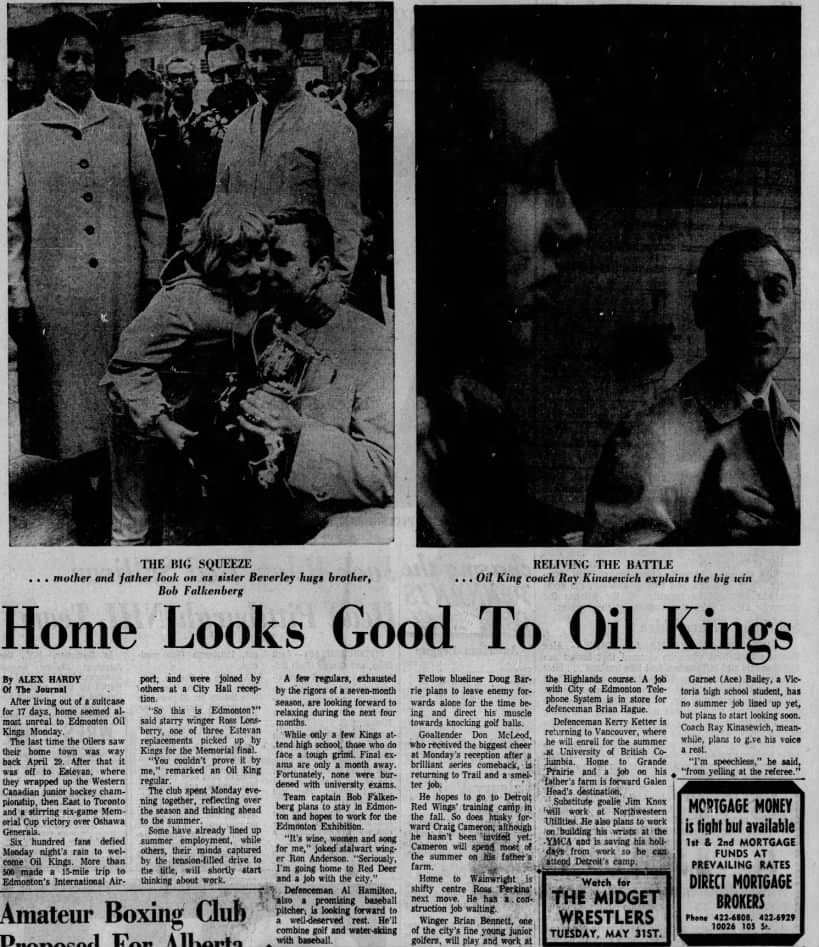 A May 17, 1966 Edmonton Journal article talks about the Edmonton Oil Kings returning home Memorial Cup champions.