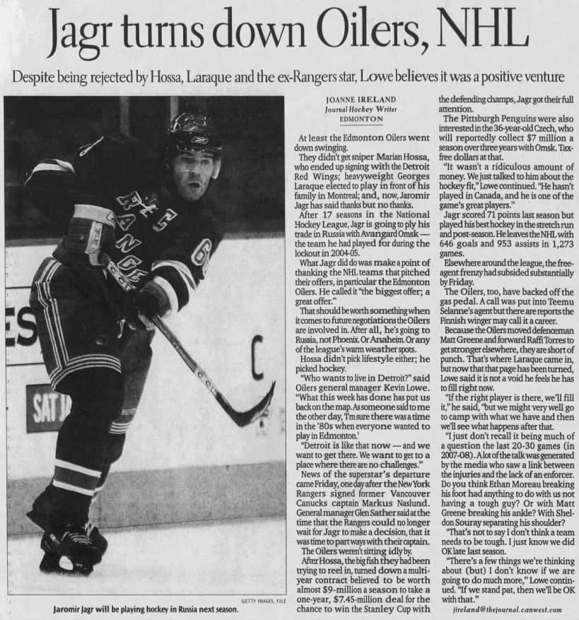An Edmonton Journal article from July 5, 2008 details how Jaromir Jagr turned down an offer from the Edmonton Oilers.