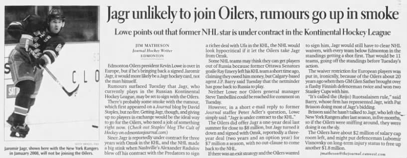 An Edmonton Journal article from February 12, 2009 details rumours of Jaromir Jagr joining the Oilers.