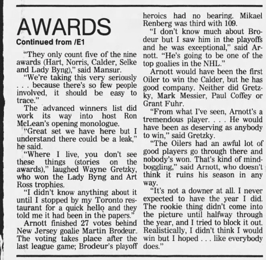 No Oilers has ever won the Calder Trophy for the league’s top rookie, though three have finished in second place in voting, Arnott in 1993-94, Ryan Nugent-Hopkins in 2011-12, and Stuart Skinner in 2022-23. Gretzky was ineligible for the Calder Trophy because he had played his rookie season at the professional level in the World Hockey Association.