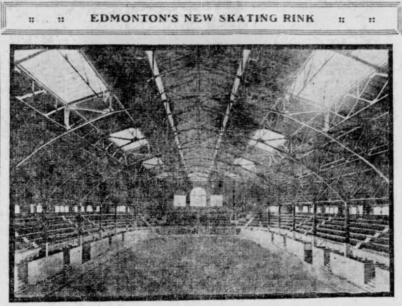An Edmonton Journal article from Nov. 15, 1913 shows the inside of the Edmonton Stock Pavilion, later renamed the Edmonton Gardens. It was the city’s first dedicated professional hockey rink. The first game was played here between the Eskimos and Dominions of the Edmonton Inter-City League on Christmas Day, 1913.