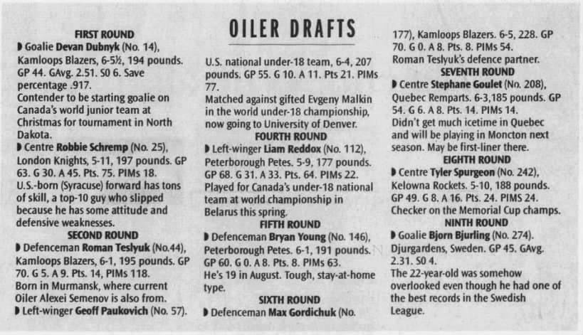 A June 28, 2004 article from the Edmonton Journal details who they selected in that year’s NHL entry draft over the two days prior.