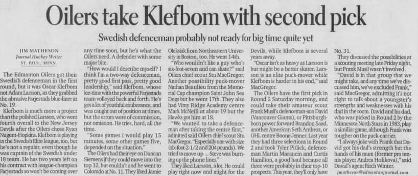 An Edmonton Journal article from June 25, 2011, details the Edmonton Oilers drafting defenceman Oscar Klefbom with their 19th overall pick.