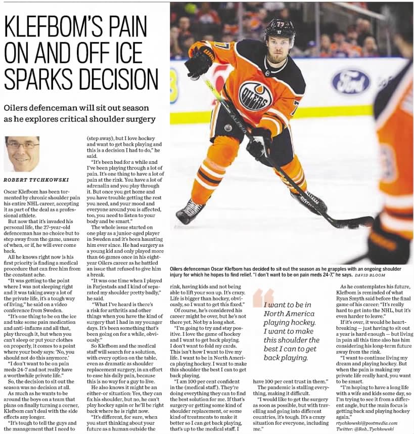 A January 12th, 2021 Edmonton Journal article details Oscar Klefbom electing to miss the following season due to chronic shoulder issues.