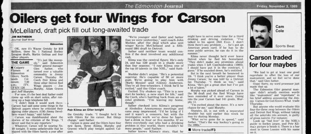 After sitting out for nearly a month, the Oilers struck a deal to send Carson to his hometown Detroit Red Wings in exchange for Petr Klima, Joe Murphy, Adam Graves, and Jeff Sharples.