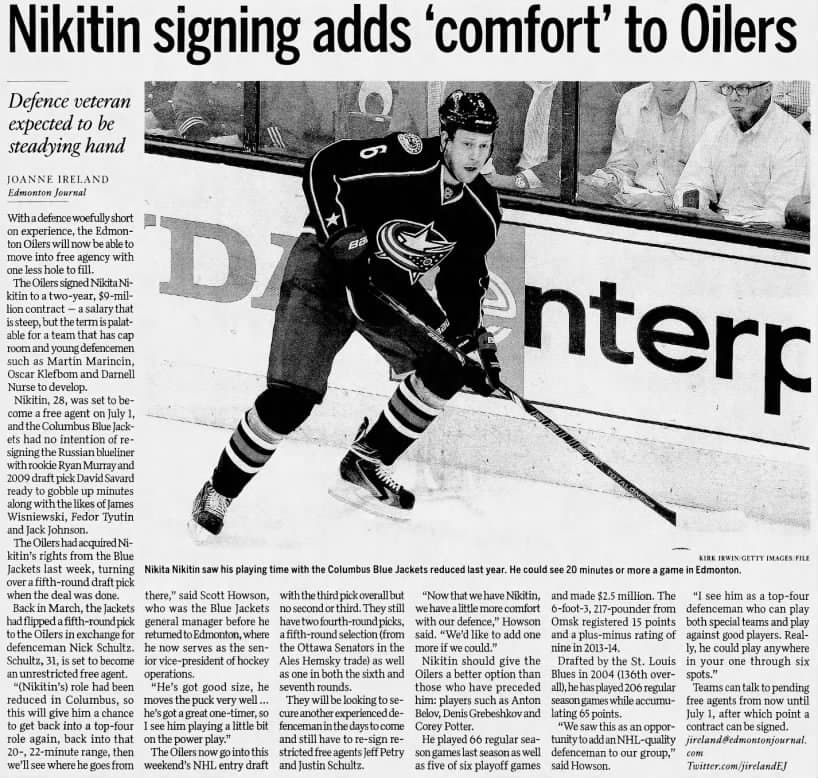 A June 26, 2014 article from the Edmonton Journal highlights the Edmonton Oilers’ signing of defenceman Nikita Nikitin.