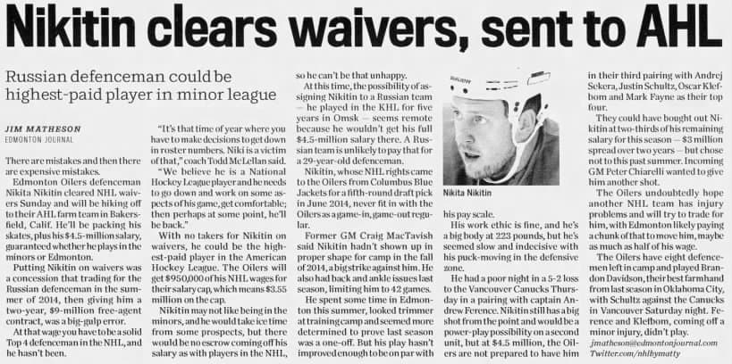 An Edmonton Journal article from Oct. 5, 2015, details Edmonton Oilers defenceman Nikita Nikitin being assigned to the AHL.