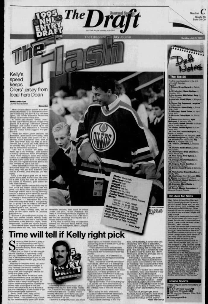 Fans at the Coliseum were chanting ‘Doan, Doan, Doan!’ as the Oilers were set to make their pick but general manager Glen Sather didn’t listen. The Oilers selected Steve Kelly, a speedy winger from the Prince Albert Raiders, much to the disappointment of the many observers who had visualized Doan in orange and blue.