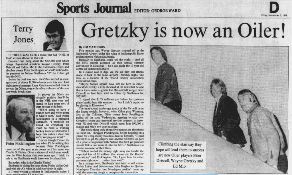 Nelson Skalbania signed Gretzky to a seven-year, $1.75 million contract with a $50k signing bonus to play for the Racers. After just eight games, Gretzky, Driscoll, and Mio were sold to Oilers’ owner Peter Pocklington so that Skalbania could handle the expected loss of $1 million from the Racers’ season.