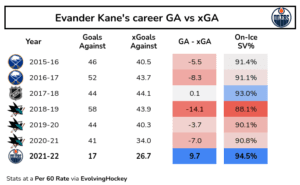 The more notable thing driving Kane’s fortune is his defence. Edmonton’s goaltenders currently have a SV% of 94.5% with Kane on the ice.