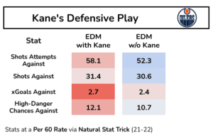 Edmonton allows fewer shots, shot attempts, expected goals, and high danger chances against with Kane off the ice. Most of his linemates (most notably Draisaitl) see a solid improvement in their defensive totals without Kane, and his defensive track record isn’t encouraging either; his xGA impact from 18-19 – 20-21 ranks in the 24th percentile.