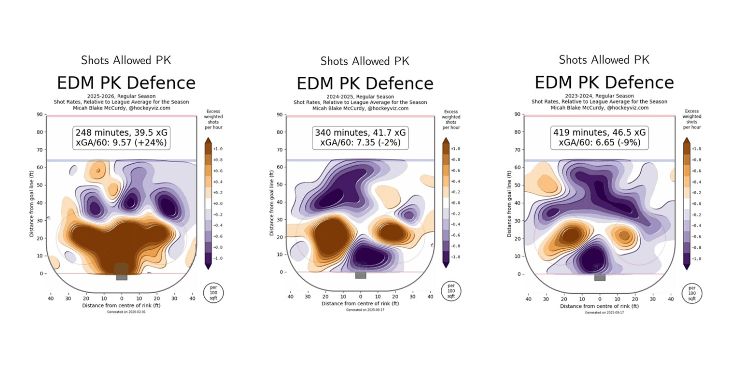So how bad are some of these new problems? The heat maps below from HockeyViz help illustrate the results, showing Edmonton’s penalty kill shot locations over the past three seasons. Orange areas indicate where the Oilers have allowed more shots, while purple highlights areas where they’ve prevented them.