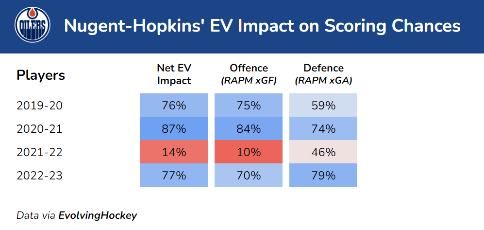 All things considered, while Nugent-Hopkins certainly isn’t the most spectacular producer at even strength, he’s a very effective EV player nonetheless, with positive impacts at both ends of the ice.