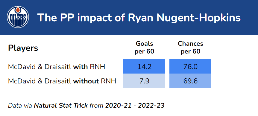 However, remove Nugent-Hopkins from the power play entirely, and their scoring rate dips all the way to 7.9 goals per hour.