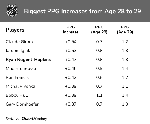 Claude Giroux had the biggest PPG increase from age 28 to 29. In 2016-17, he had 58 points in 82 games, and in the following season, he had 102 points in 82 games. Nugent-Hopkins ranks third on this list, as he had 50 points in 63 games last season, and currently has 100 in 79, a PPG increase of roughly +0.47.