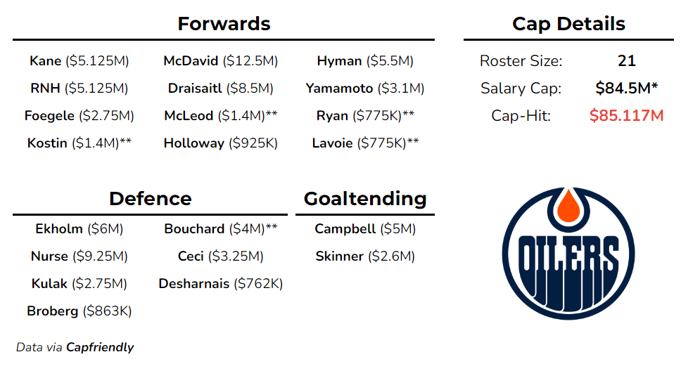 With all of that in mind, here’s how the roster would look if Edmonton signed most of their UFAs and RFAs (assuming a cap ceiling of $84.5M):