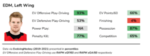 After struggling to play as the 3C in 20-21, the role he was initially signed for, Turris is currently competing to play as a 4th line winger. Turris was an excellent offensive player in Ottawa, possessing a great shot and strong transition abilities, but he regressed quite a bit in Nashville and hasn’t shown any flashes of his former self in Edmonton so far.