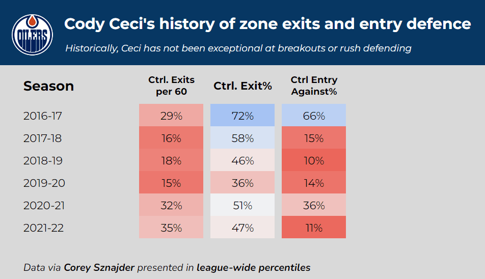 Nurse’s skating and puck retrievals are his greatest strengths, but he struggles at defending the rush and efficiently passing the puck out of the DZ. His ideal defensive partner is someone that ranks well in those areas. However, Ceci was Edmonton’s worst rush defender this year, allowing a higher rate of controlled zone entries (64%) than any Oiler defender. He also ranked last on the roster in DZ Pass-Outs per 60 in the playoffs.