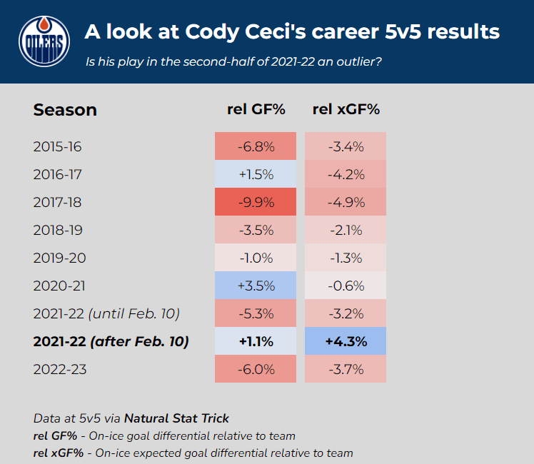 For the first half of the 2021-22 season, Cody Ceci was primarily paired with Duncan Keith on the second pair. Following the mid-season coaching change, Ceci was deployed on the top pairing with Darnell Nurse. This was a role in which he initially thrived in.