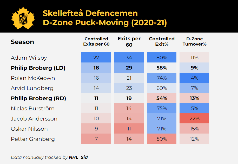Nashville prospect Adam Wilsby was Skellefteå’s best puck-mover by a big margin. When listed as an LD, Broberg ranked second on the team in total and controlled exits per 60, but he had a lower (better) turnover rate than Wilsby, so Broberg generally ranked well here. However, in games where he was listed as an RD, Broberg’s exit volume significantly decreased, and his turnover rate went up. We can already see a difference in his quality of play when moving to his off-side.